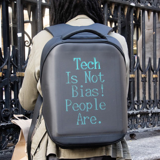 LED Backpack: symbolised data visibility and cyborg identity. The binary code loop became both language and barrier. An archive of absence displayed in public.